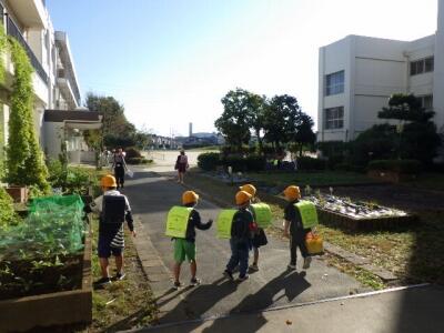長い歴史のある校地内を、1年生たちが元気に登校してきました。