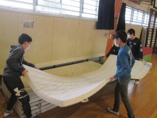 体育館の掃除をしたり、マットを整えたり、イスを並べたり・・・。