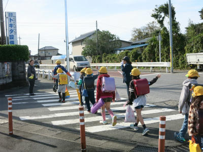 交通指導員さんの指示をしっかり聞いて渡ります。
