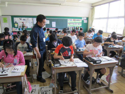 3年生、初めての書写(習字)です。道具の使い方を学んでいます。
