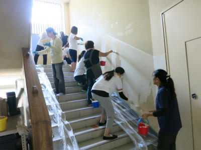 PTA役員、保護者と教職員が一緒になって、校舎内のペンキ塗り作業を行いました。50名を超す保護者のご協力のもと、見違えるほどのきれいな昇降口と廊下になりました。