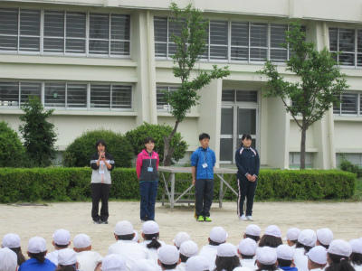 全校児童の前で、選手によるリレーです。応援態度も立派でした。