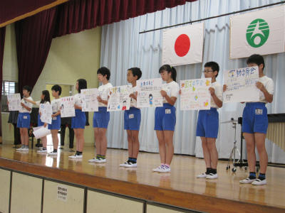 5月1日は、豊野小学校145回目の誕生日です。そこで、5月の全校朝会は、145年の歴史について、校長がスライドを使って話しました。