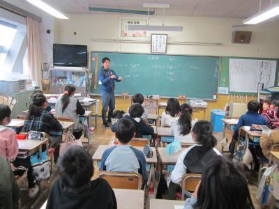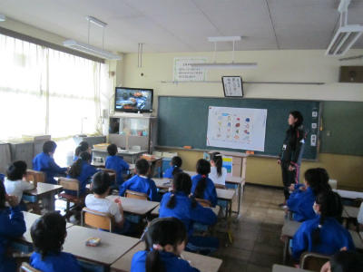 雨が降り出した寒い朝です。教室では、朝の英会話活動が行われています。