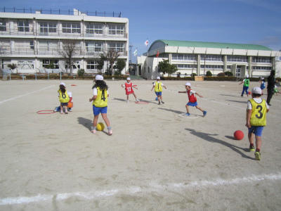 暖かな陽射しの中、子供たちは元気に運動しています。