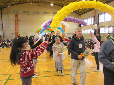 記録発表の後、校長から「お手本を見せてください。」と言われ、全校の前で6年1組に跳んでもらいました。歓声が上がりました。かっこうよかったです!