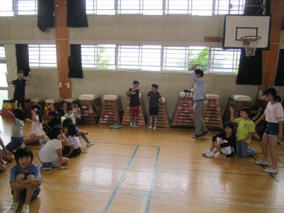 豊野ギネスに輝いた人たちのがんばりに拍手を送り、改めて全員に夏休みに自分の得意を作るよう話しました。