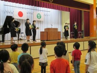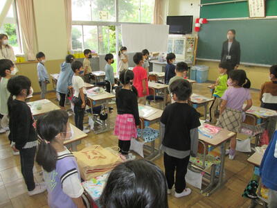 駆け付けた教頭先生に、6年生が手紙と花束を渡しました。