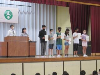 市内陸上大会と硬筆展(市・県)の表彰が行われました。