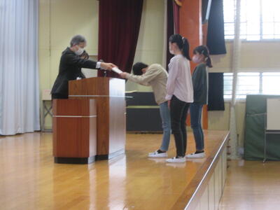 図工、理科、家庭科、国語の夏休み作品展等で入賞したみなさんに、校長先生から表彰していただきました。