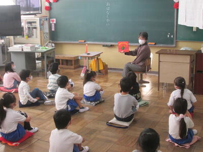 1年生から今月の生活目標についてのお話です。やさしい言葉づかいをします。