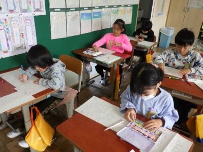 1年生は、フェルトペンで「ふじ山」という字を書きます。