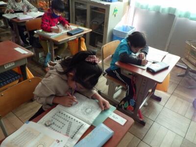 3年生の教室。ランドセルの中身を机の中に移し終えると、それぞれが自習を始めます。