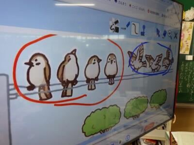 教科書にかかれている鳥や花の絵を見ながら、4+3=7の式になるたし算のおはなしを考えます。