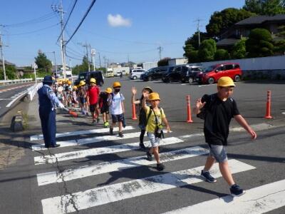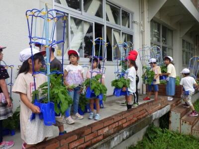 牛島小の子どもたちに向かって、みんなであいさつをしました。
