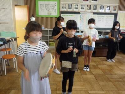 音楽に合わせ、タンバリンと鈴を鳴らしました。