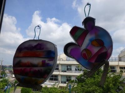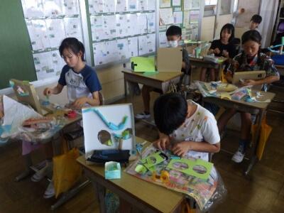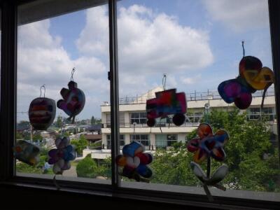3年生の廊下の窓に、図工の作品が展示してありました。