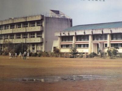 撮影日の記録は残っていないのですが、プール建設が昭和38年、校地の拡張が昭和42年であることから昭和43年頃ではないかと推測されます。東側に拡張された校庭は少し土の色が茶色く見えます。