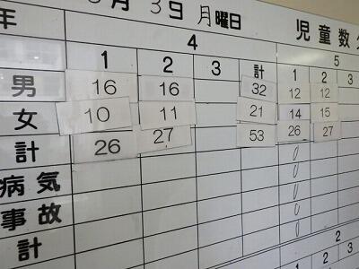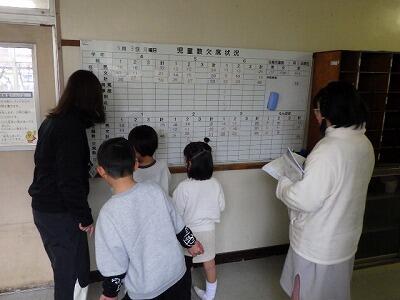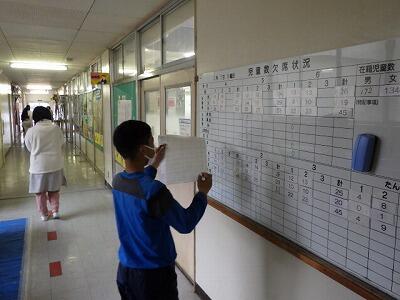 職員室前の出欠ボードに、毎朝保健係の児童が人数を記入します。