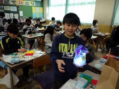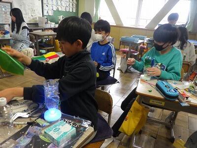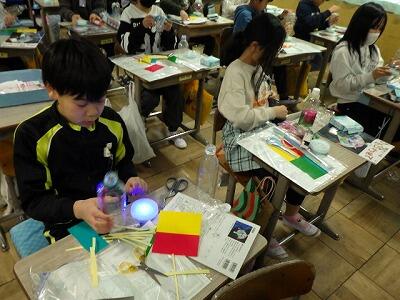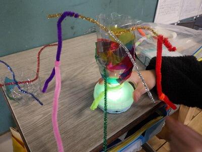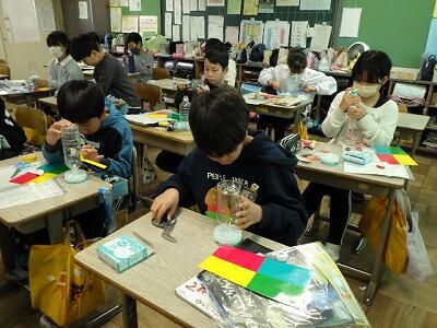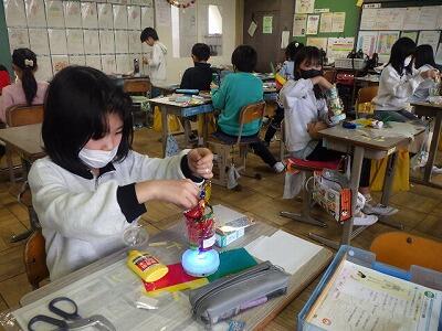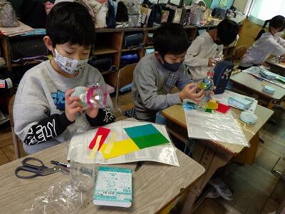 ペットボトルにセロファンシールを貼って、オリジナルの「ゆめいろランプ」を作っていきます。
