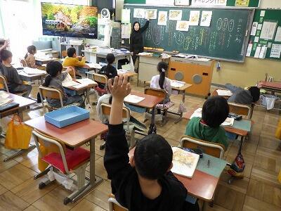 黒板には「みんな、元気にすごしていましたか?」と書かれています。