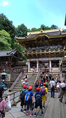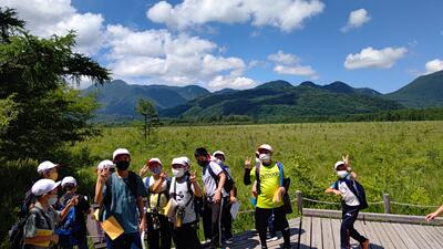 中禅寺湖に着きました。学年で記念撮影の準備。