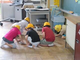 防災頭巾や机、ランドセルなどで、頭を守る練習をしました。
