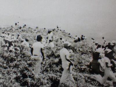 複数の学年合同の徒歩遠足の写真であると思われます。