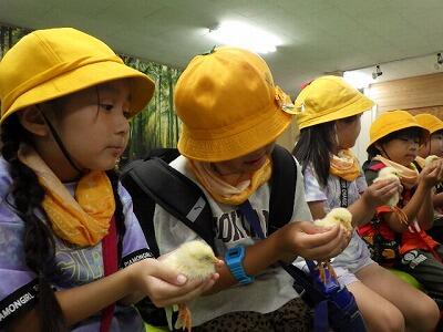 昼食の後、ヒヨコ、ウサギ、モルモットと触れ合いました。