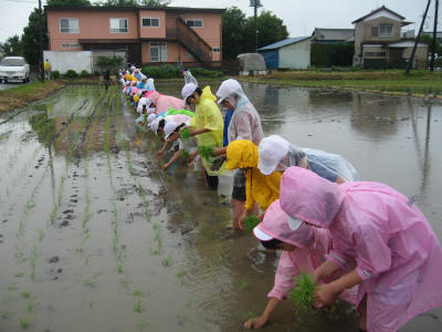 5年生は、赤米保存会の皆様のご協力のもと、田植え体験を行いました。あいにくの雨でしたが、初めての体験ということもあり、どの子も一生懸命田植えを行いました。これから世話をし、秋の収穫が楽しみです。
