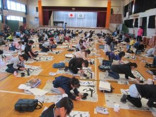 今日は、校内書きぞめ競書会です。体育館で中学年が行っています。