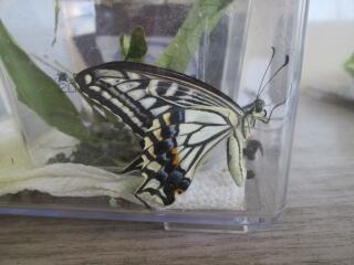 幼虫から育てたアゲハチョウが蛹から出てきました。