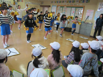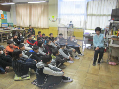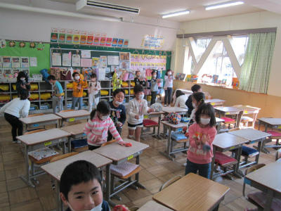 1年生のクラスに新しい友達が、来てくれました。一緒に音楽を楽しみました。