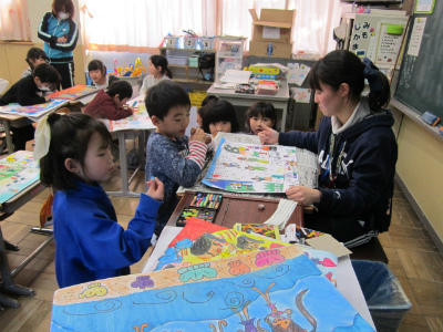 教師からアドバイスを受けて、さらに楽しい作品に仕上げようとしています。