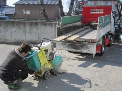 アスファルトを切る音の大きさに思わず耳を塞ぐ子供たちです。