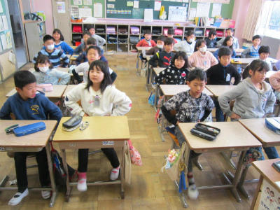 今朝は雨のため、教室で、さわやかタイムをやっています。
