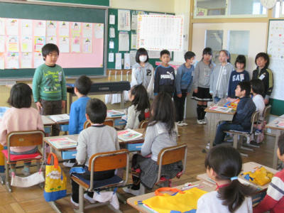 1年生が、入学式で入学児童に発表する「在校生歓迎の言葉・校歌紹介」の最後の練習を行いました。
