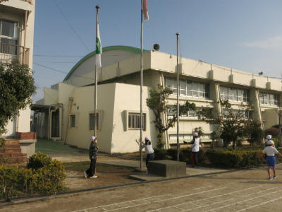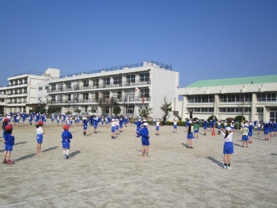 雨上がりの正門で、豊野小元気にあいさつし隊があいさつ運動をしています。