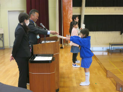 第3学期の修了式が行われました。代表児童が、修了証を壇上で受け取ります。