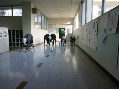 明日の卒業式に出ない1,2,3年生にとって、今日が6年生との最後のお別れです。廊下で6年生を送ります。