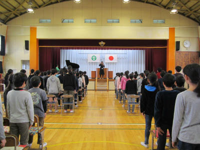 式の途中で静かに会場に入り、すわって出番を待ちます。教員も座って雰囲気を出します。