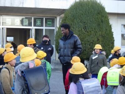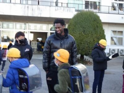 今日は、中心選手のLJ.ピーク選手が豊野小に来てくださいました。
