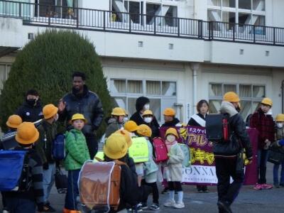 越谷アルファーズは、登校する子どもたちへのあいさつを通したふれあい活動を実施しています。