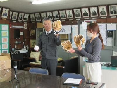 給食の時間、大谷翔平選手から寄付されたグローブがGoogle Meetで披露されました。