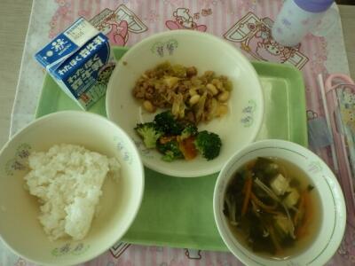 給食では、豆板醤、甜面醤を使ってアクセントをつけた味にしました。