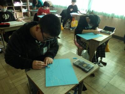 ちょうどよい太さの彫刻刀を選んで彫り進めます。