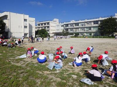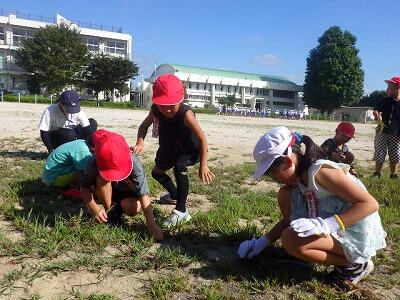 気温が上がる前に、全校児童で校庭の除草作業を行いました。