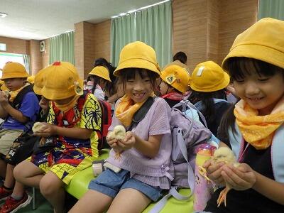 昼食の後、ヒヨコ、ウサギ、モルモットと触れ合いました。