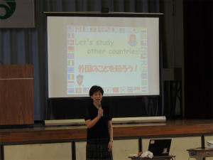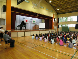 今日は、1学期の終業式がありました。校長先生の講話の後、JTEの福田先生から英語でクイズを交えながらお話をしていただきました。また、夏休みを迎えるにあたって気を付けることに関しては、豊野駐在所の富田さまからお話をいただきました。