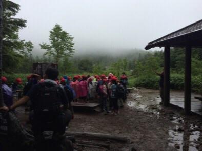 雨の降る中、子供たちは元気にハイキングに出発しました。(前山リフトにて)